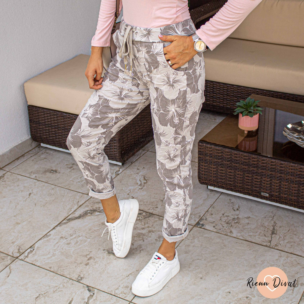 Rena gumis derekú rugalmas viszkóz nadrág - virágos mokka
